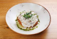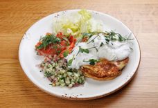 Драники с лососем, яйцом пашот и тартаром из огурца
